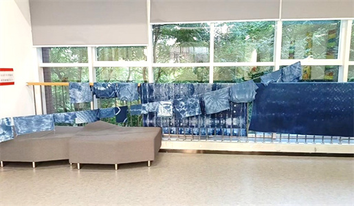 5月19日,亦庄实验小学项目部在知悉情况后,主动加入扎染课后勤保障工作。保洁员们凭借多年积累的污渍处理经验,通过利用各种环保药剂及专业工具对泼洒在地面、台面的顽固染料,耐心的反复擦拭,对染布过后的水盆、染缸等工具进行专业清洗,尤其是在清洗扎染作品时,更是小心翼翼,一遍一遍的漂洗,唯恐染料污渍残留,损及作品的完美呈现。正因为保洁员们这般积极出色的表现,让学校美术主任高度赞誉:“扎染课后,保洁团队拿走扎染后的布帮助清洗,让每一块布料重新舒展成最鲜亮的模样。整齐排列的布匹不仅是艺术的延续,更是保洁团队对亦小学生的温柔回应:匠心不在惊天动地,而在将学生珍视之事默默捧于掌心。感谢您们以汗水为墨,在平凡的日常中书写最动人的诗篇”。