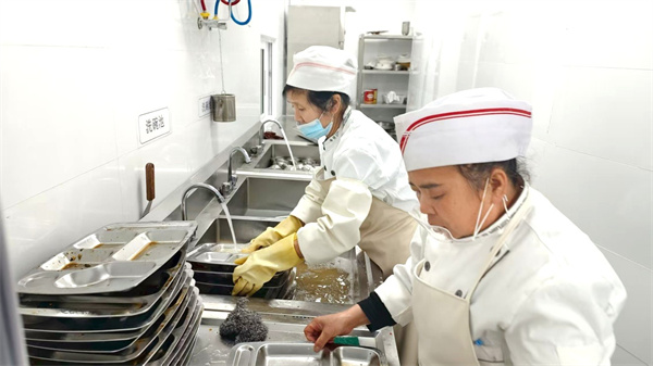 收餐后的卫生清理与餐具清洗,是项容不得半点马虎的细致活。尤其是不锈钢餐盘上,食物残渣早已凝固变硬,清洗难度不小。洗碗大姐王春花却始终耐心细致,对每一个餐盘都坚持多遍冲洗、逐个仔细检查,不放过任何一处污渍,确保每一件餐具都洁净如新。