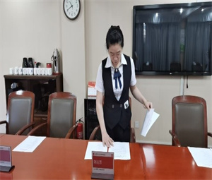 为确保会议高效有序开展,项目经理豆彦飞率领会务人员王晓楠、胡秋翎子协同开展筹备工作。根据会议要求,提前完成会场布置与细节检查:规范摆放桌椅座次、定制会议标识、调试电脑 / 鼠标 / 翻页笔等设备,备齐茶水、白开水等饮品,并统筹门前迎宾等全流程接待服务。同时,在另一个接待室备妥茶水及矿泉水,安排专人在门前值守待命。针对会议服务标准,明确要求会务人员提前 30 分钟抵达会议室门前迎宾,会前再次全面检查会场设施,确保设备运行、物品摆放等环节零疏漏。