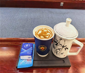 10月10日,最高检领导一行赴房山检察院调研。作为项目部重点保障的接待任务,自接到通知起,便快速启动专项筹备机制。以“精细筹备、高效执行”为核心准则,即刻进入工作状态,从需求对接、流程优化到细节排查,逐项推进落实,全力保障调研活动顺利开展。同时,鉴于本次会议的重要性,项目部在会务服务中特别增设咖啡服务,并精心设计以“獬豸”为主题的专属拉花图案。作为能辨别正邪、判断曲直的瑞兽,獬豸在检察系统中具有特殊象征意义——它不仅代表着法律的神圣不可侵犯,更隐喻着检察官坚守正义、维护社会公平的职责使命。将其融入咖啡拉花设计,既提升了服务细节的精致度,也让法治文化元素自然融入会议场景,与调研活动的检察属性高度契合。